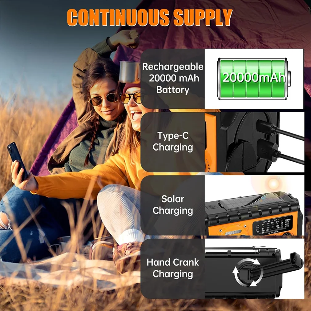4.All in one NOAA radio, mobile power, flashlight, reading light, SOS siren, solar charger and FM entertainment.