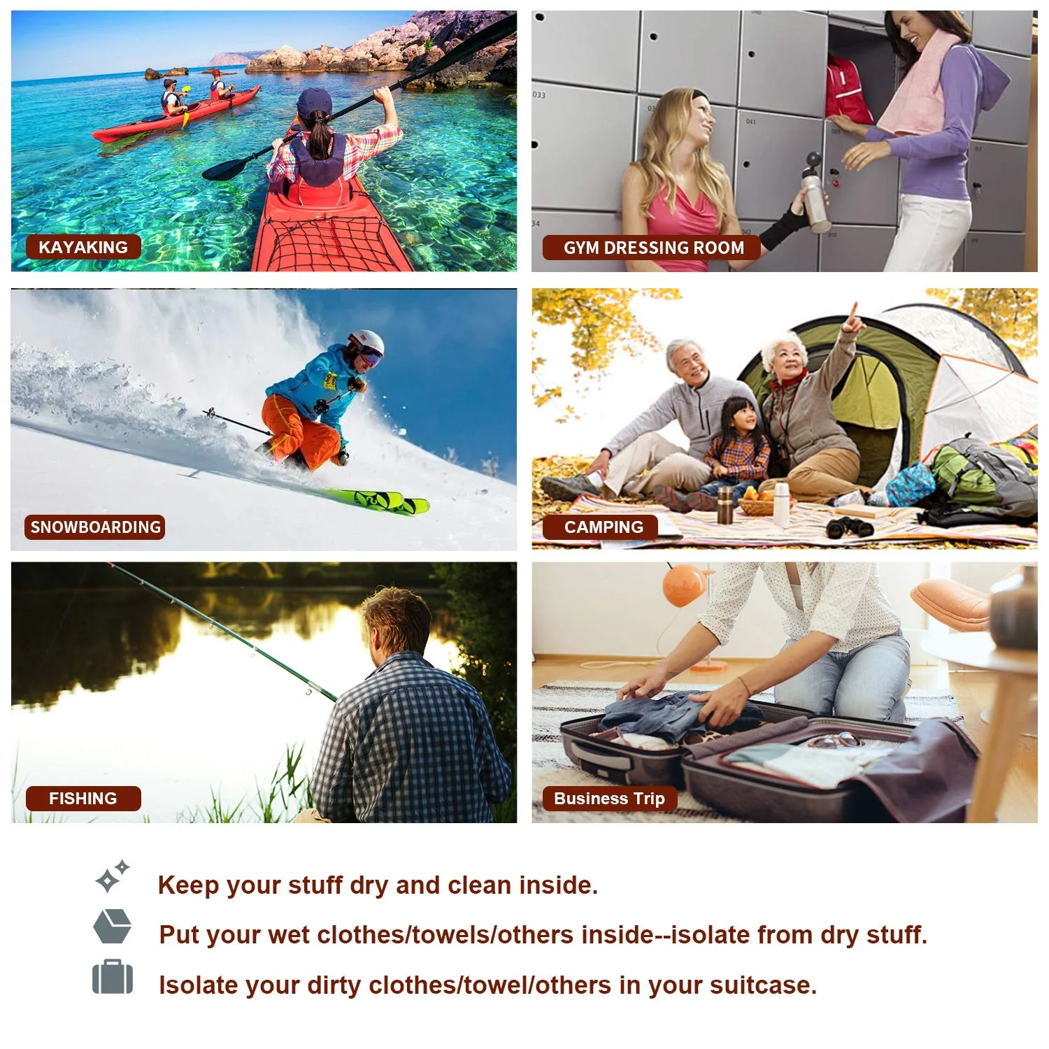 Widely Used : You can use these dry bags anywhere to keep your valuables dry/clean/organized. Home, travelling, backpacking, kayaking, swimming, fishing, camping, canoes, sailing, boating, rafting, hiking, snowboarding etc.