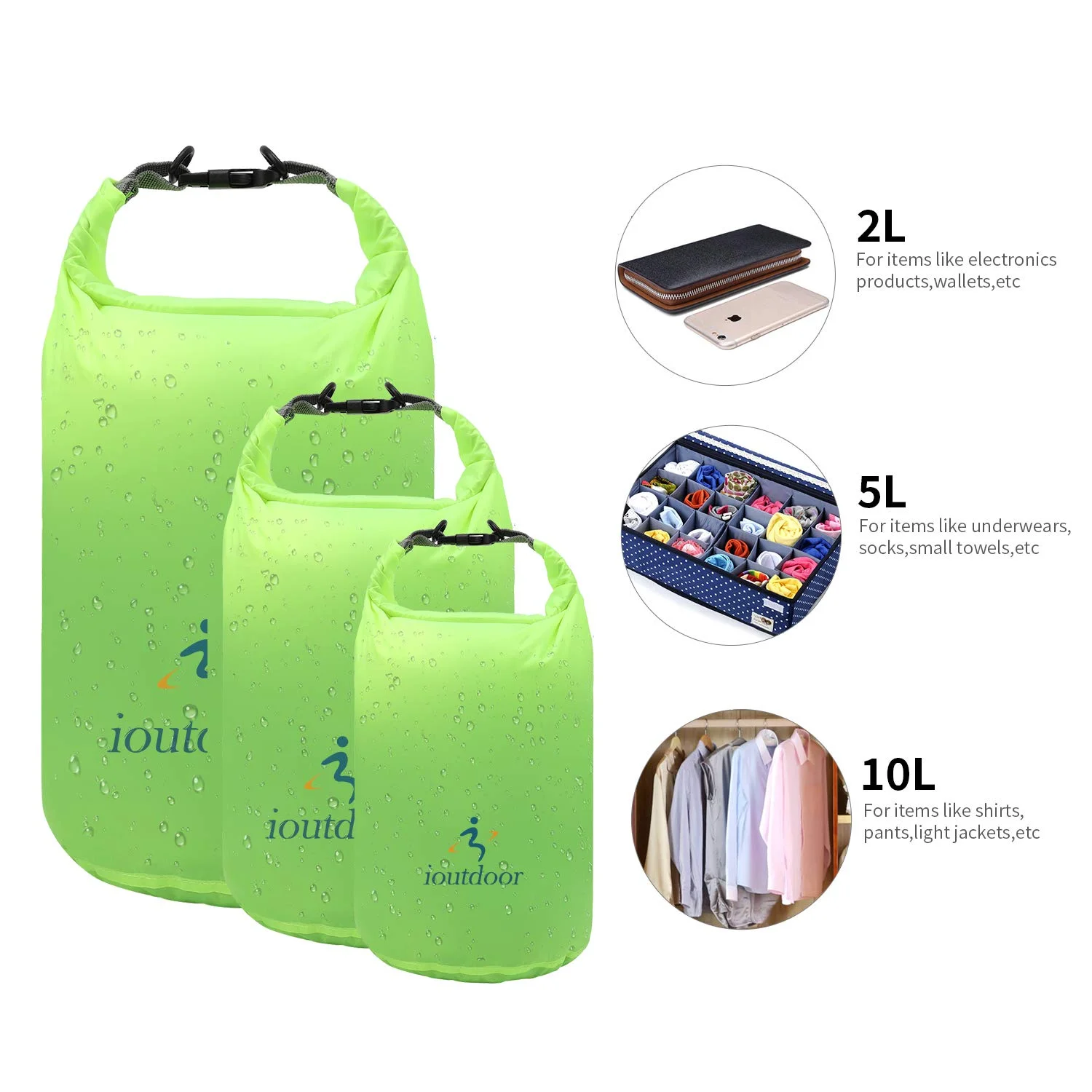 Multi-Colors& 6 Sizes for High Practicality : With bright colors which are easy to see,2L/5L/10L multi-size capacity,to pack your wallets, keys, phones, iPad, laptop, towels, clothes, shoes, blankets, sleeping bag, backpack, etc. We still have 20L/40L/70L sizes dry bag you can choose.