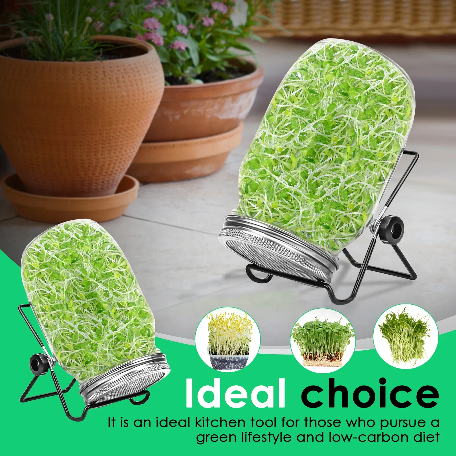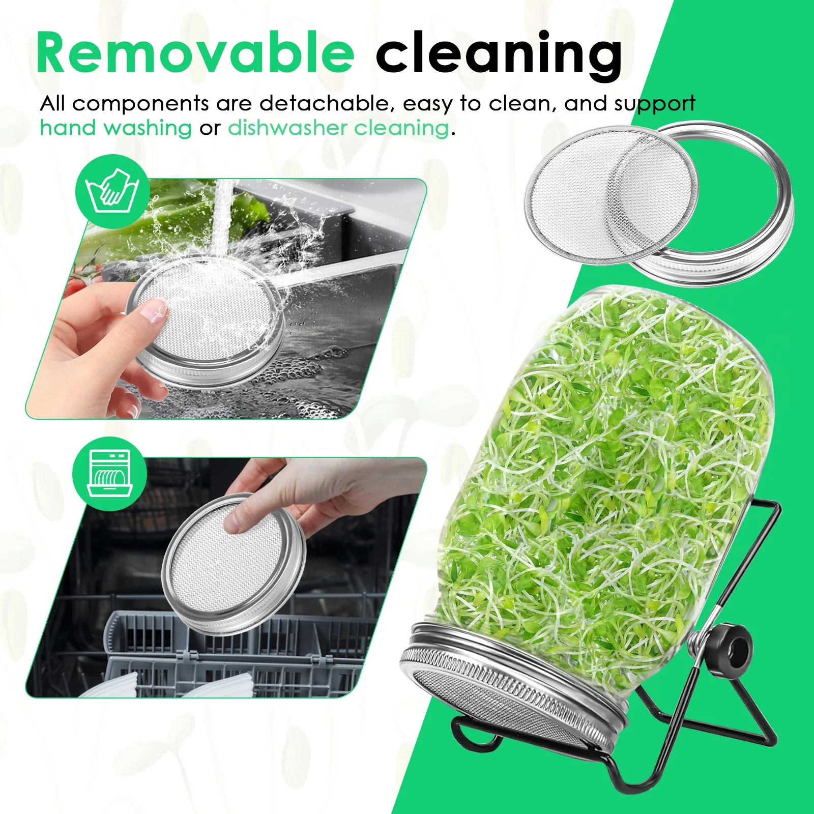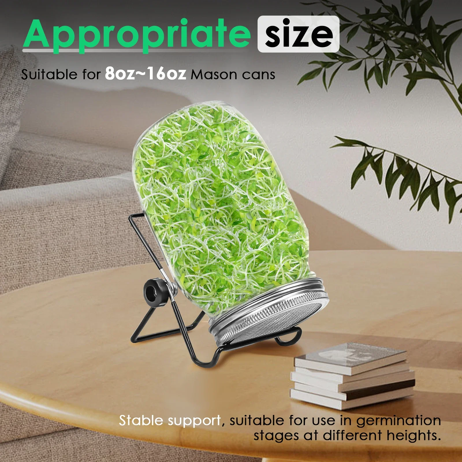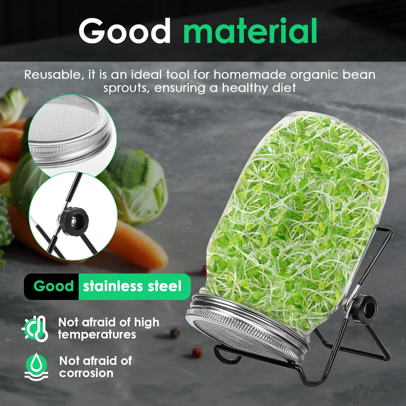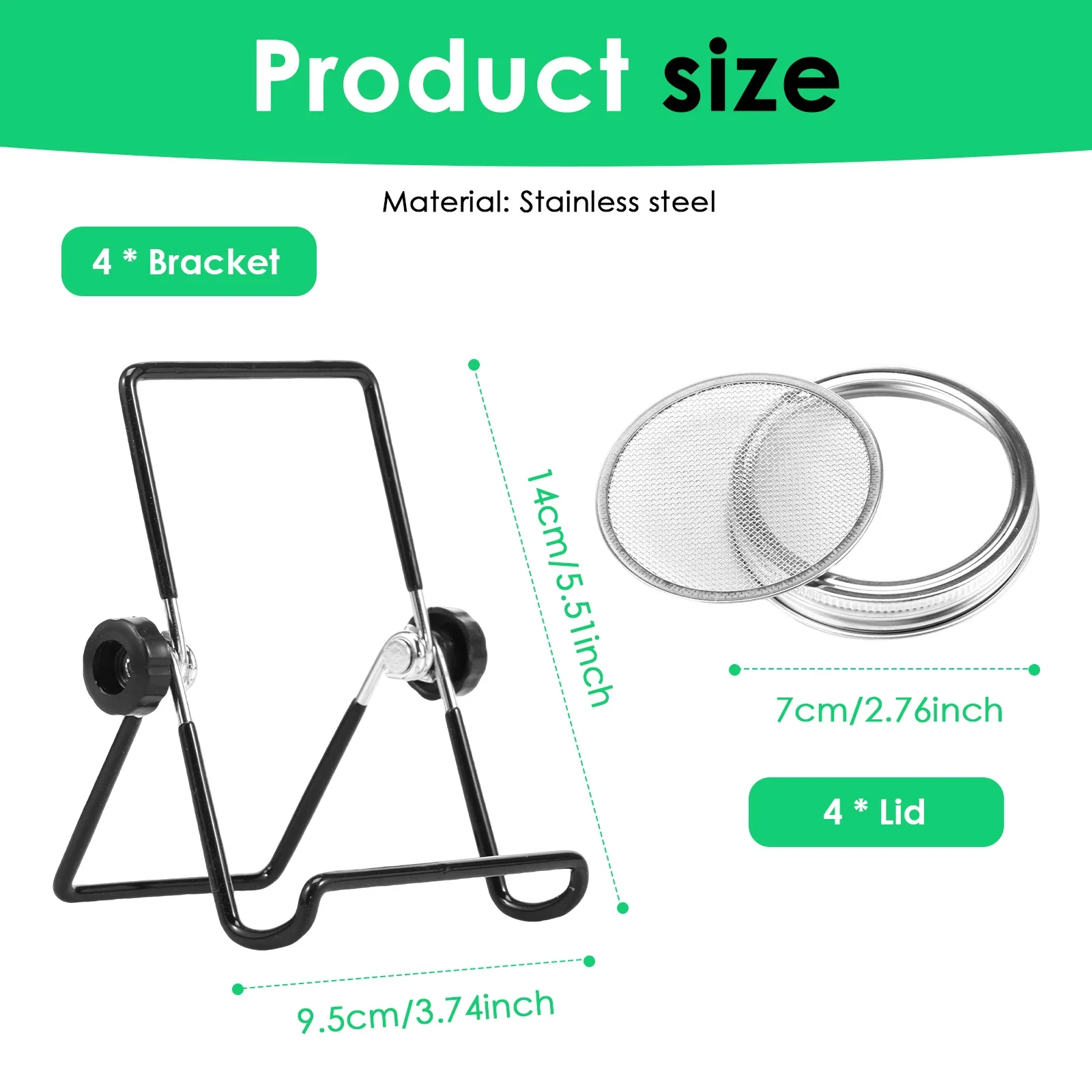 2 Size Optional : Offers two lid sizes to fit various jar types : 70 mm diameter (compatible with standard wide mouth jars like some 8 oz-16 oz glass jars) and 86 mm diameter (for larger wide mouth jars) . Includes 4 foldable stainless steel stands (9.5×14 cm) for stable support , suitable for different sprouting stages