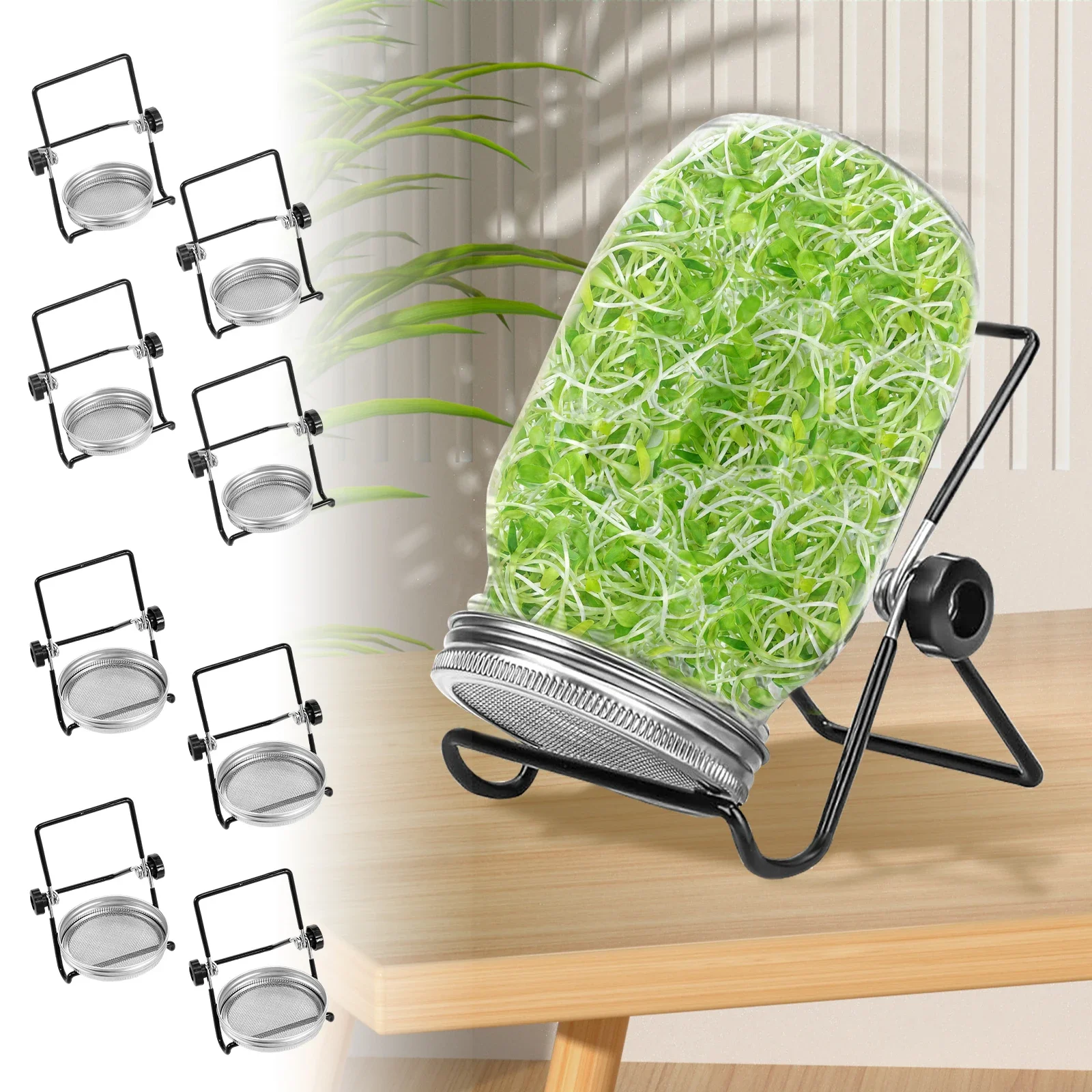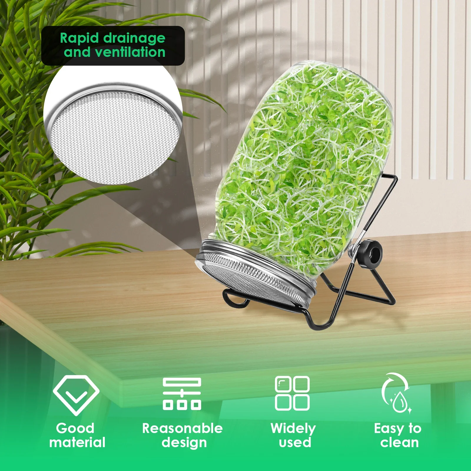 Thoughtful Design for Efficiency : Lids are designed for quick drainage and ventilation . Stainless steel stands allow jars to tilt , ensuring smooth water circulation and promoting even seed germination . No need for frequent water changes or manual stirring , saves time and effort