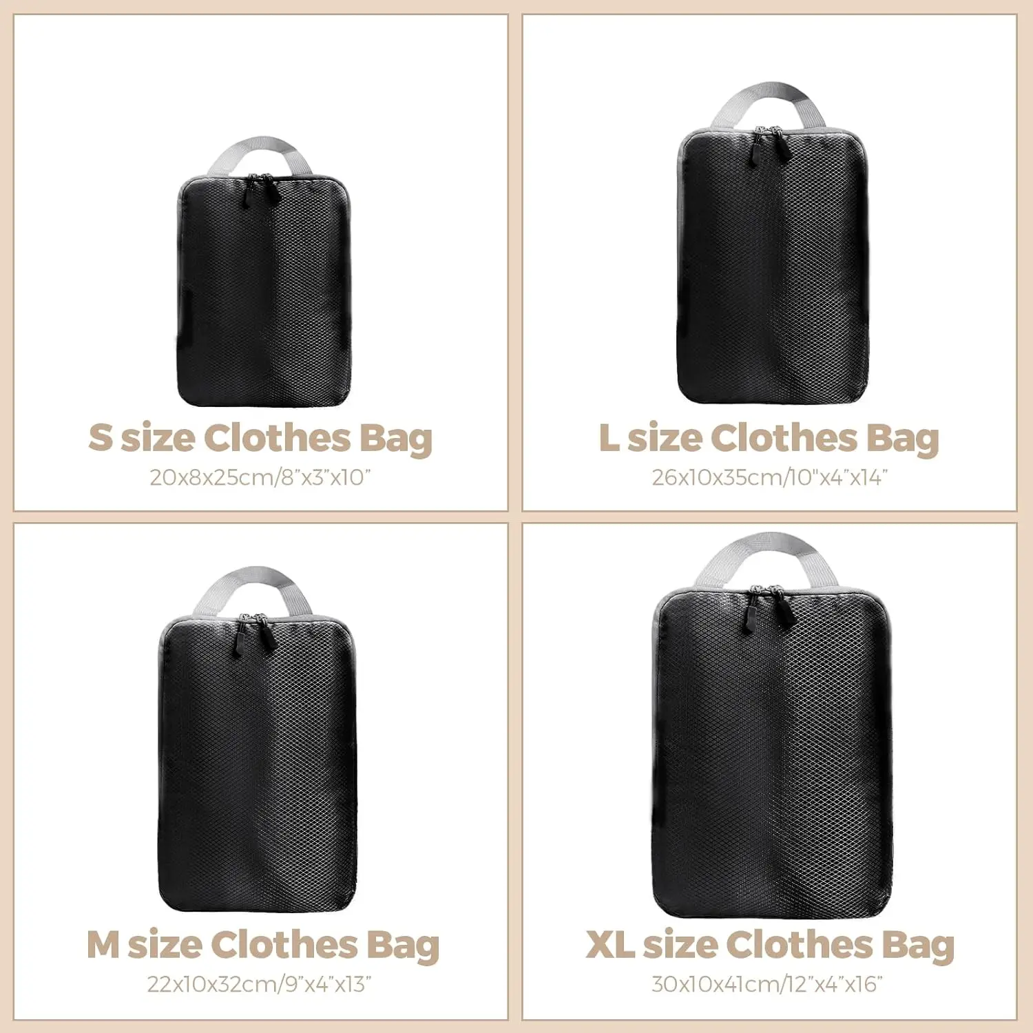 【Compressible and Expandable】The luggage can be compressed and expanded through the zipper. It is easy to operate and the compression effect is obvious. The large-capacity packing cubes can be compressed to fit more soft clothes in less space without wrinkling them. The 4 piece travel compression organizer bag set includes XL, L, M, and M compression packing cubes to meet all your luggage storage needs.