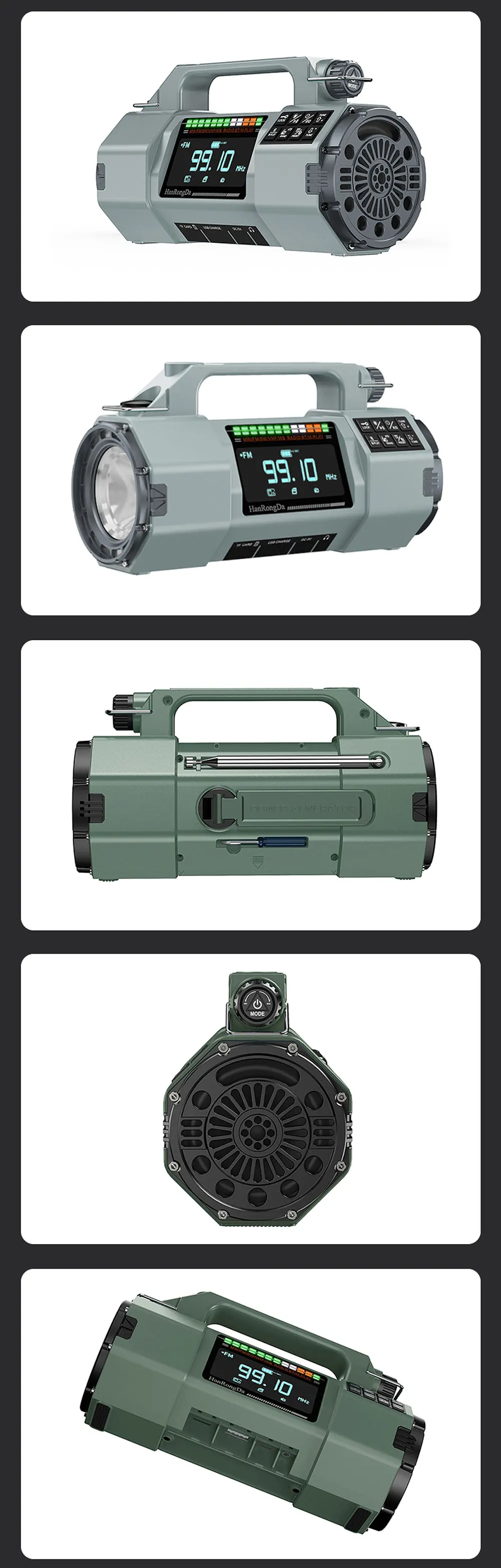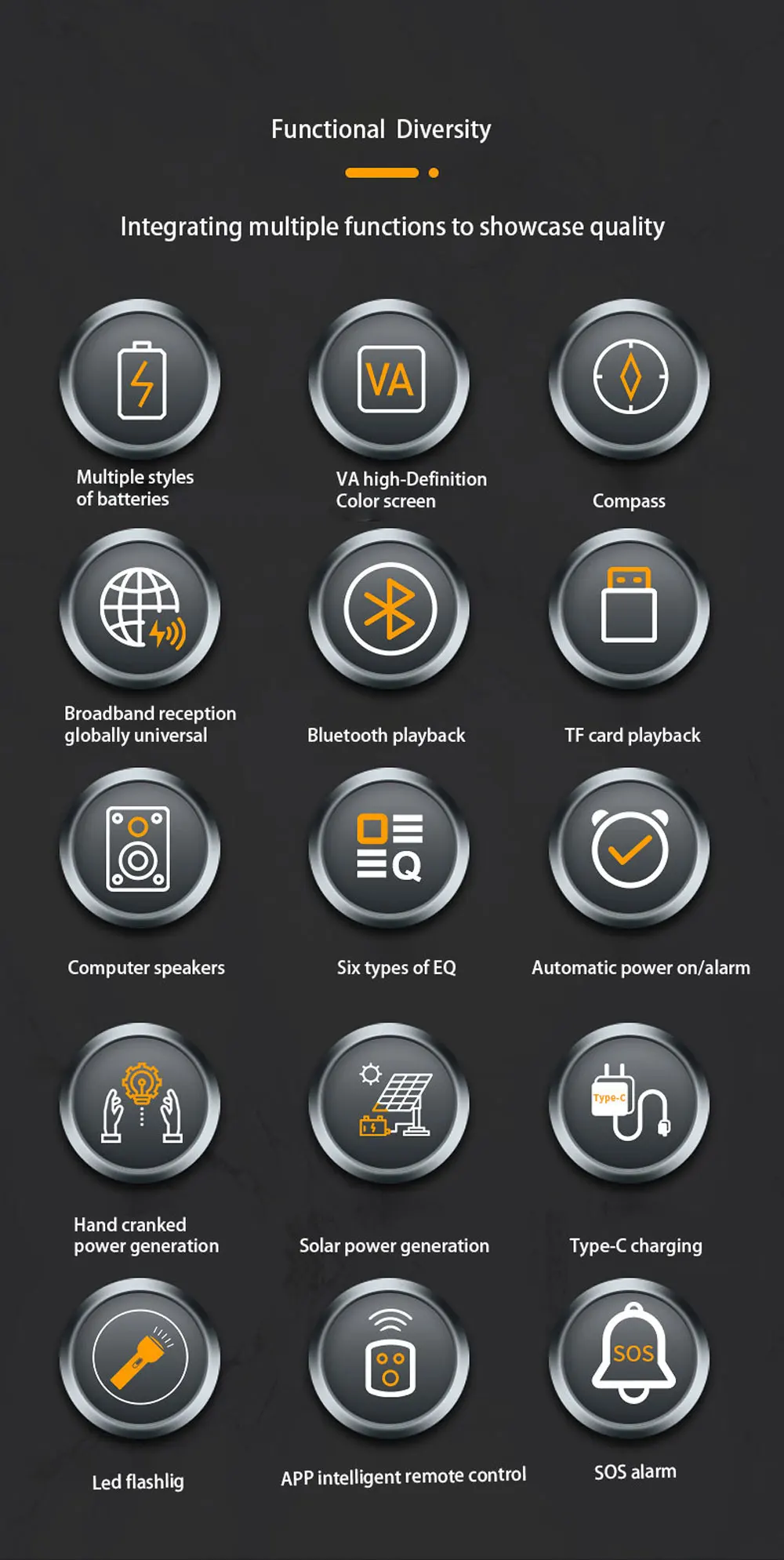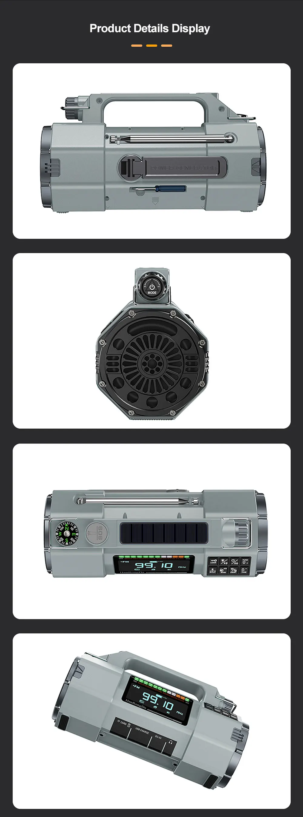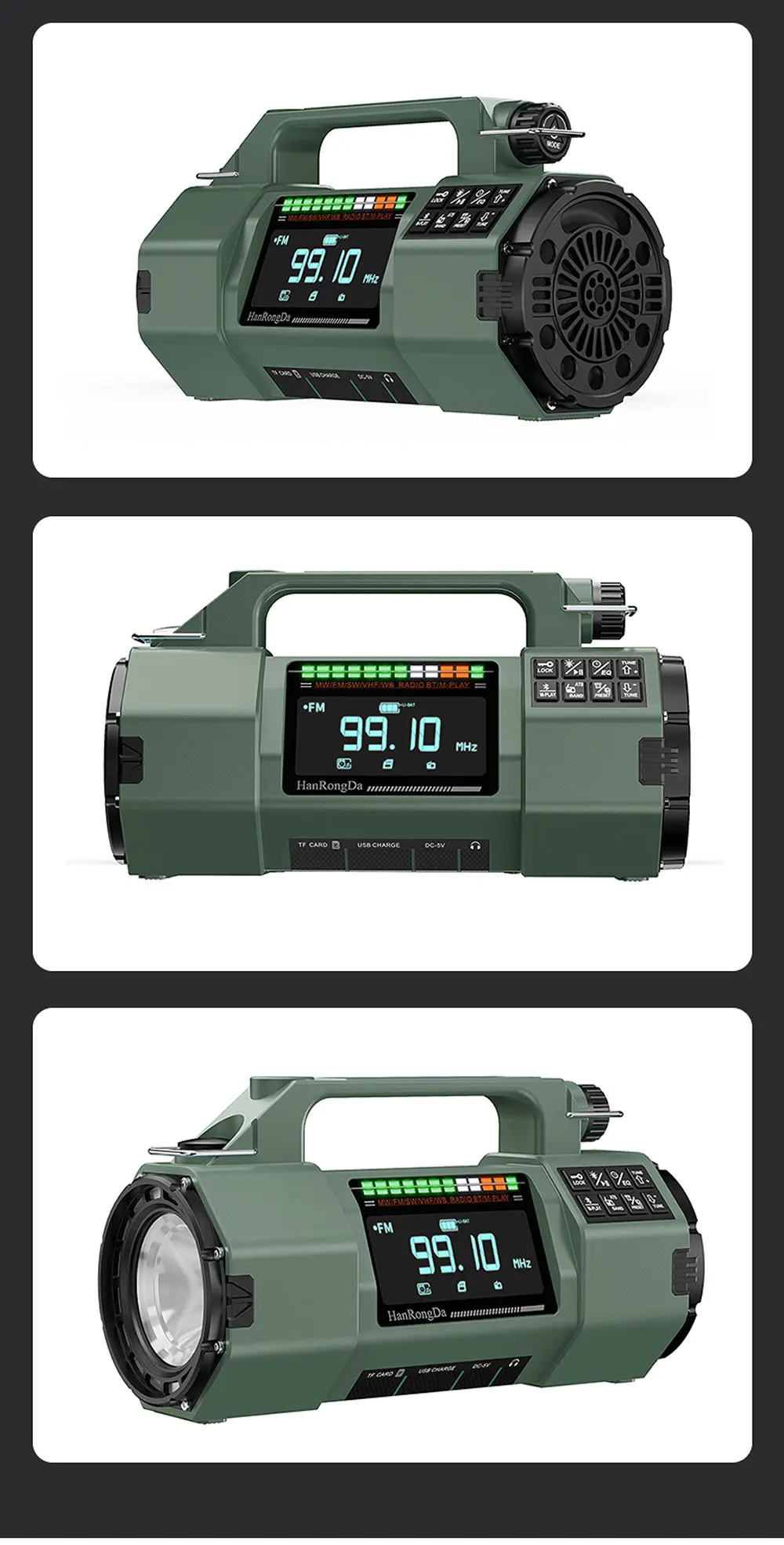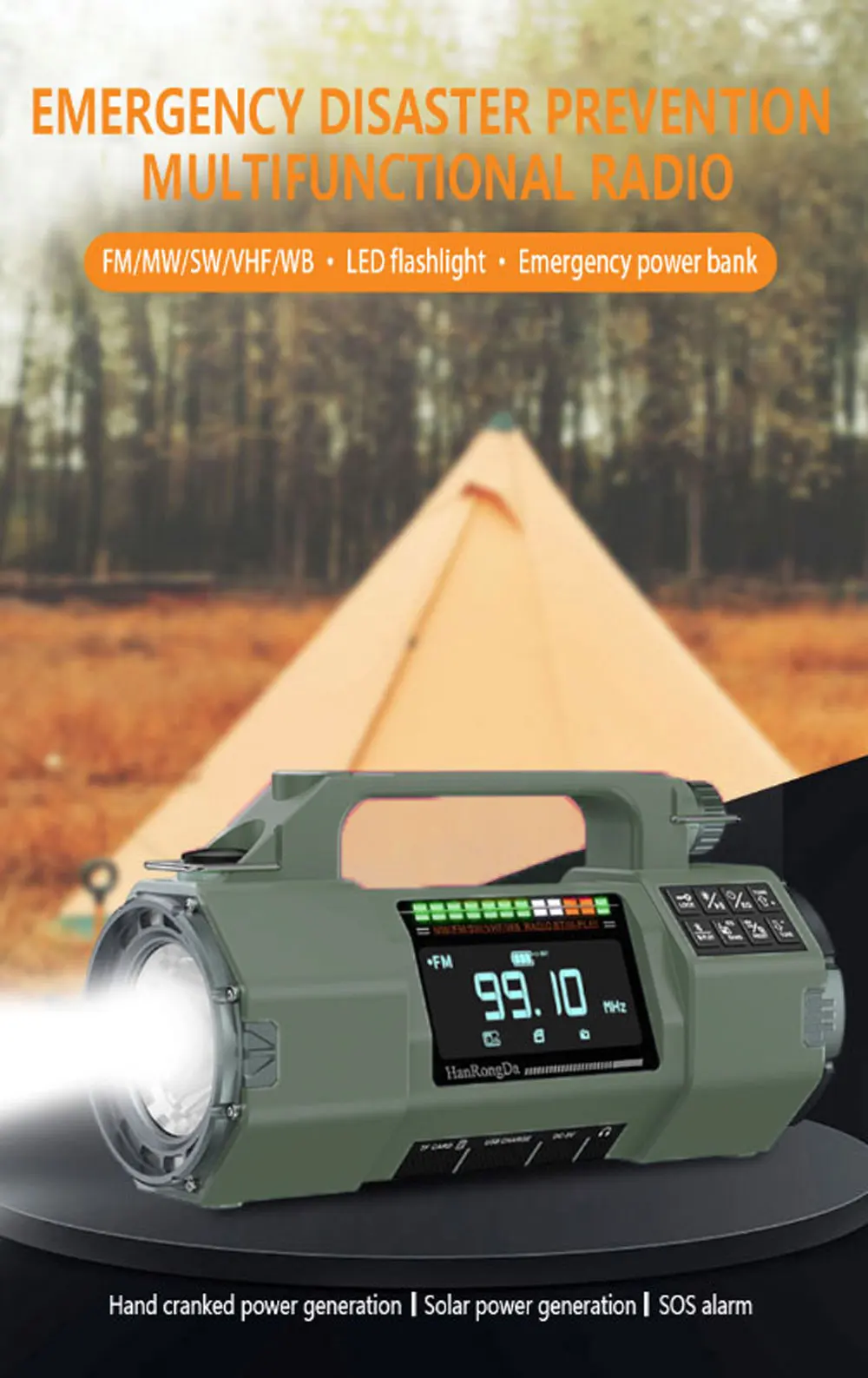 FM/MW/SW/VHF/WB · LED flashlight · Emergency power bank