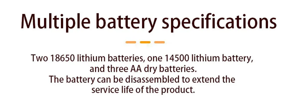 Two 18650 lithium batteries, one 14500 lithium battery, and three AA dry batteries.