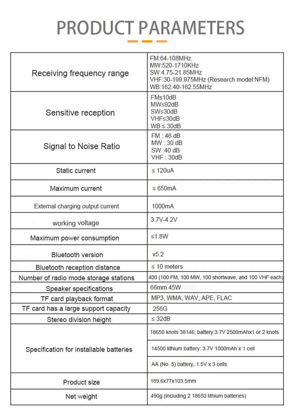 Number of radio mode storage stations:400(100 FM,100 MW, 100 shortwave, and 100 VHF each)