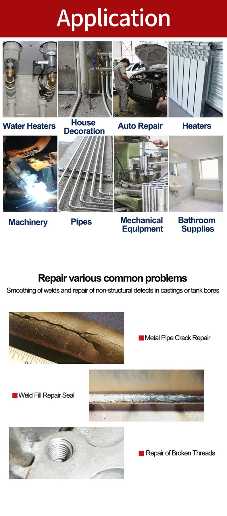 Seals leaks in tanks, pipes, joints, drains, exhaust lines, manifolds and mufflers .