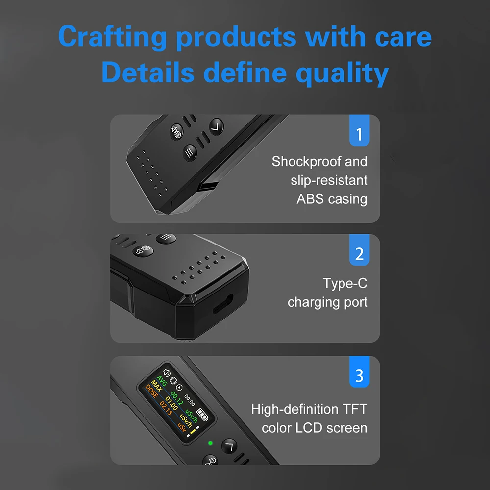 4. TFT high-definition display: Instantly shows dose rate/cumulative dose/average dose rate. Easy viewing in varying light conditions for convenient readings.