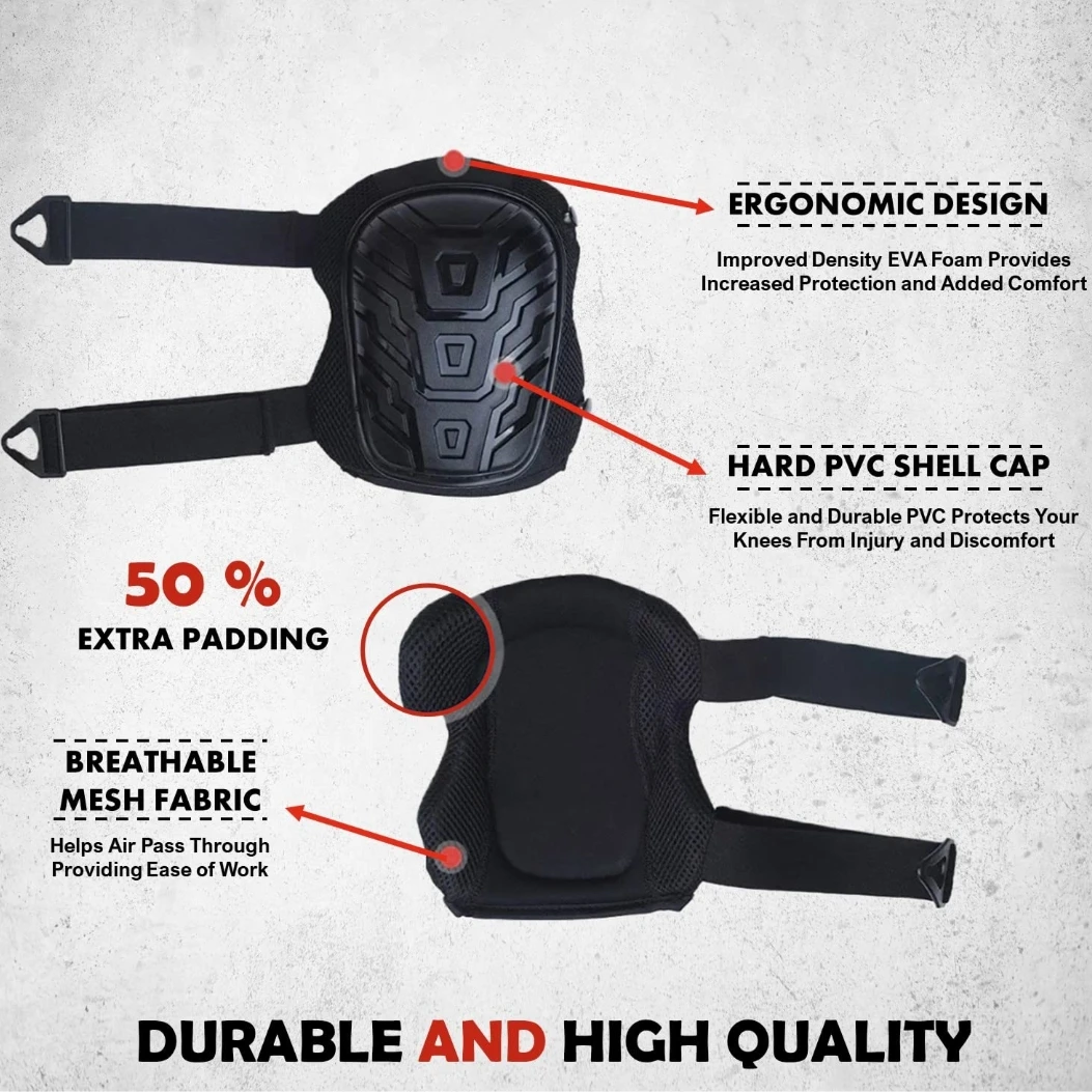 SAFE & COMFORTABLE: Our gel construction knee pads are engineered to offer your knees that extra layer of protection, ensuring safety during work. Using a heavy-duty thick poly shield, these knee pads shield your knees from cuts and scrapes, ensuring prolonged comfort during work