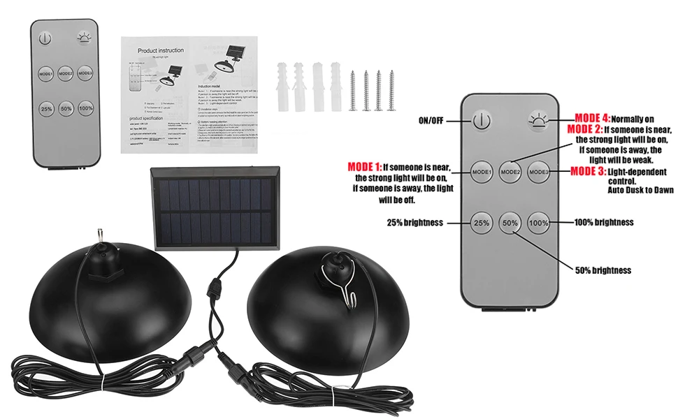 4. The upgrade solar lamp is equipped with a remote control. With the remote control you can switch the 2 solar lights on and off individually or together, adjust the brightness (25% / 50% / 100%) and set different lighting modes. (Note: the remote control must point at the lamp head, the effective distance of the remote control: 3-5m).
