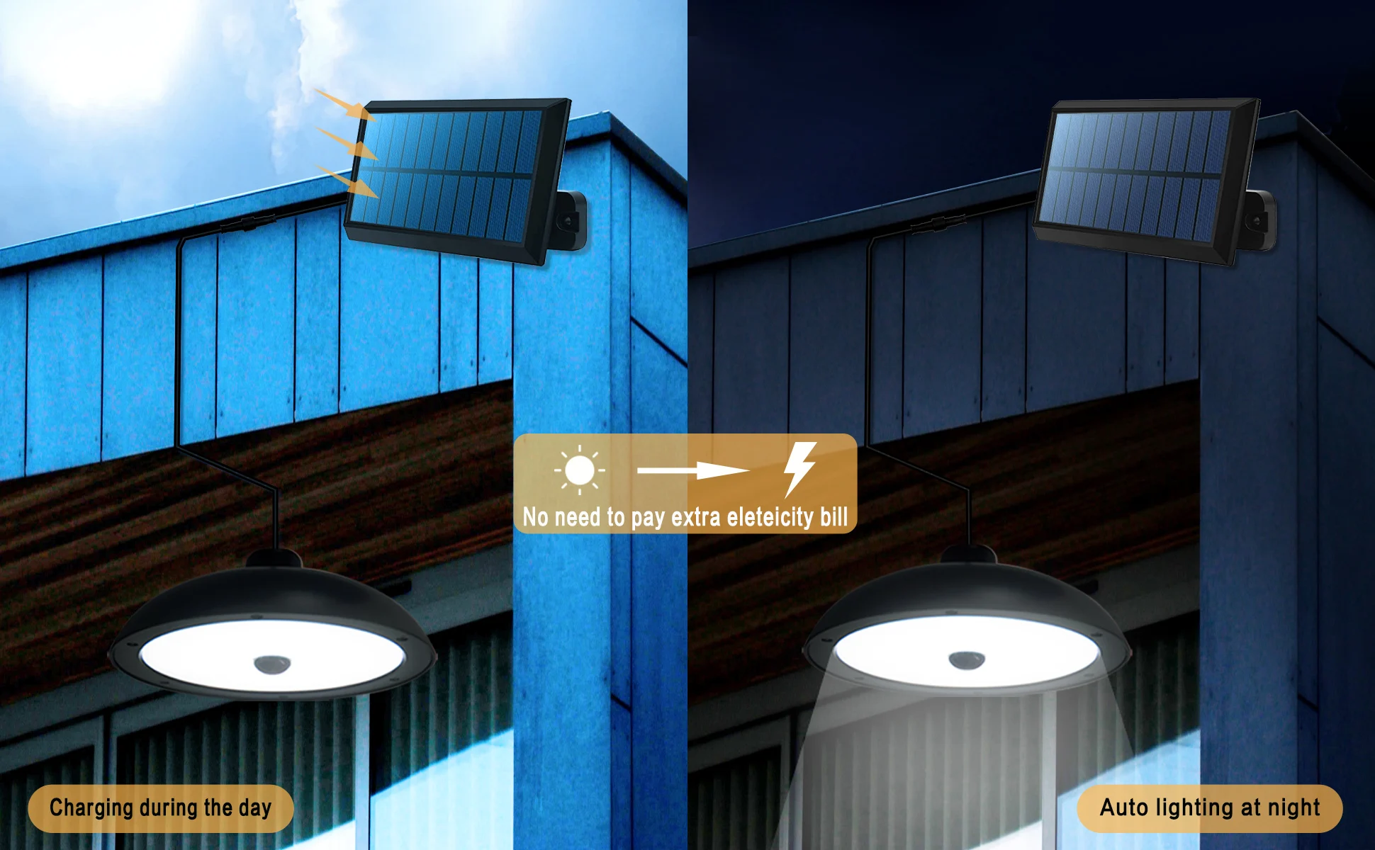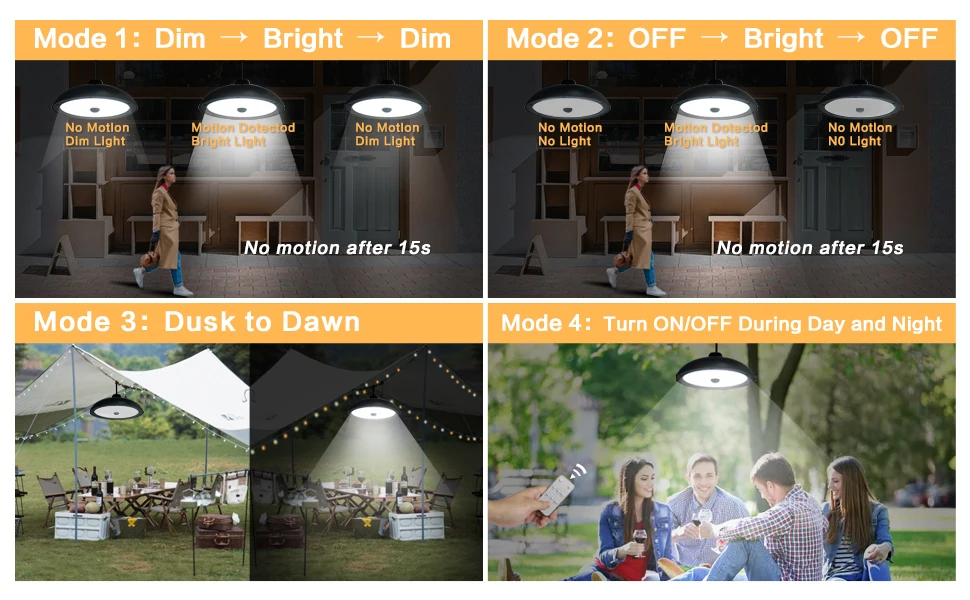 5. The solar hanging light has 4 lighting modes: 1.) Sensor mode: It lights up when it detects motion. 2.) Dimming light + sensor mode: When motion is detected, weak light (20% brightness) becomes strong light (100% brightness). 3.) Light sensor: The solar lamp is charged automatically during the day and lights up automatically at night. 4.) Always-on mode: the light is always on (100% brightness) regardless of day or night.