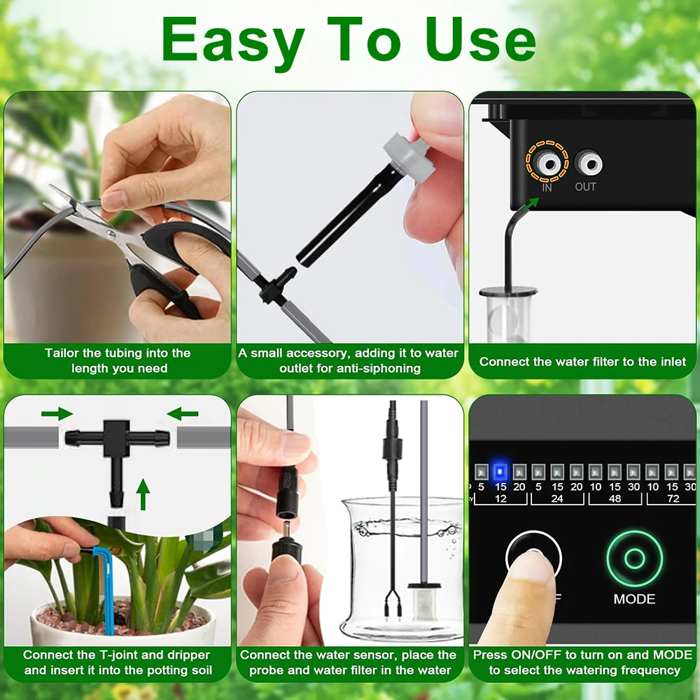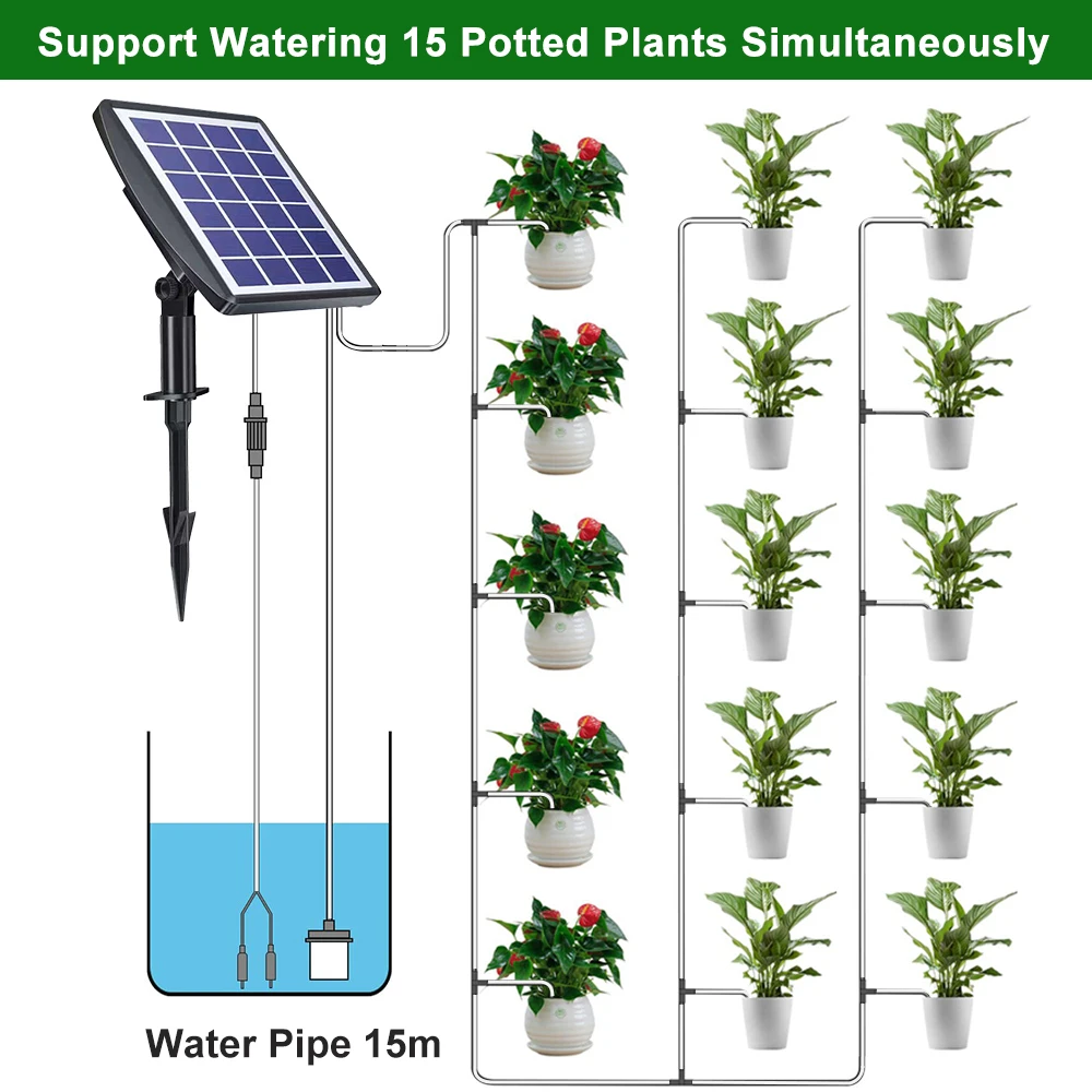 Automatic Plant Watering Kit: It's powered by solar energy that can take water directly from containers such as buckets without the need for a tap. It can automatically water your plants at preset time intervals and amounts which will automatically alarm when the water pump is idling or water shortage in the container.