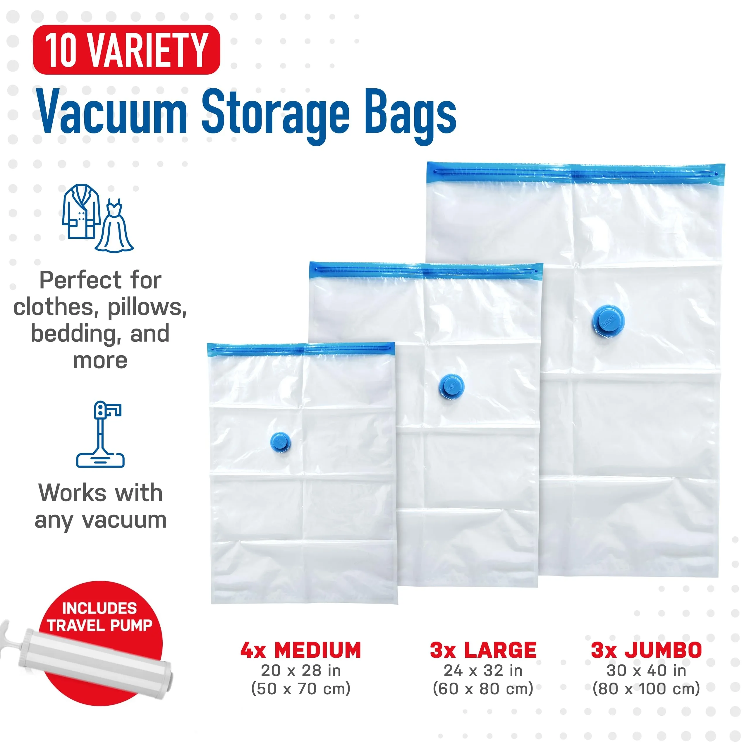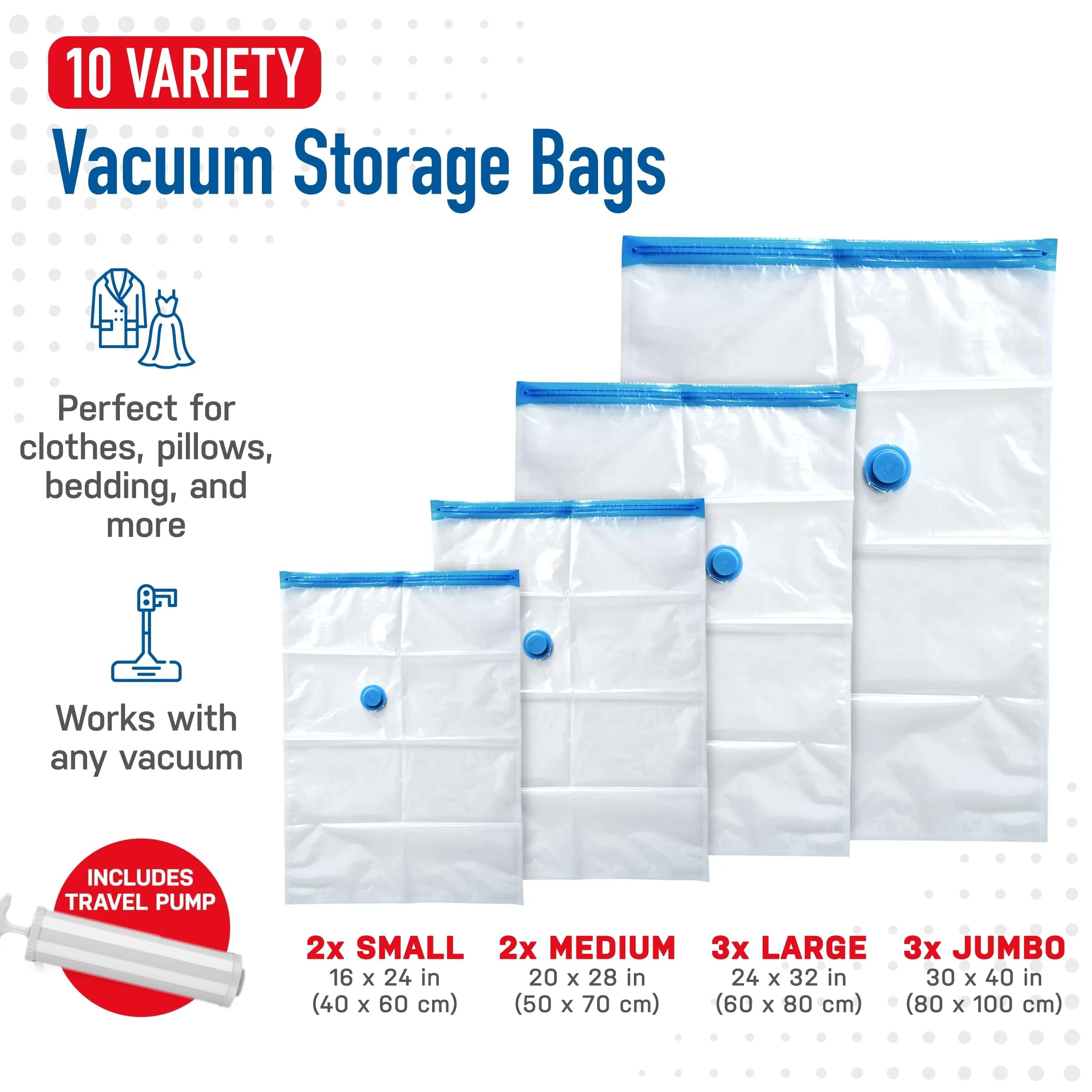 Vacuum Storage Bags , Space Saver Bags with Travel Hand Pump, Compression Airtight Sealer Bags for Clothes, Bedding, Pillows, Comforters, Blankets