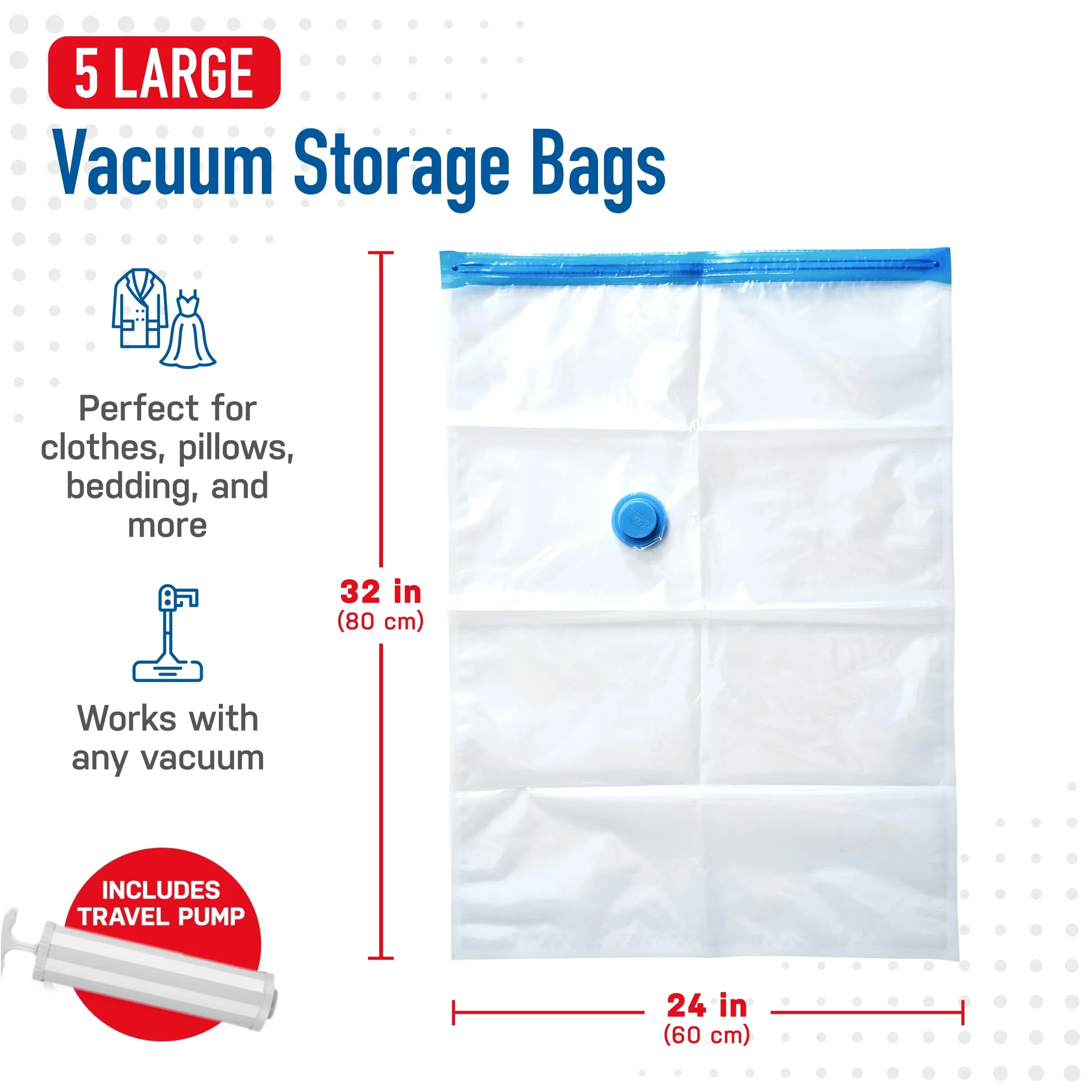Vacuum Storage Bags: Store away your comforters, blankets, duvets, pillows, towels, clothing, linens, bedding, and more. Reduce original volume by 80%. These Vacuum sealer bags are essentials for home storing, moving and travel organizing.