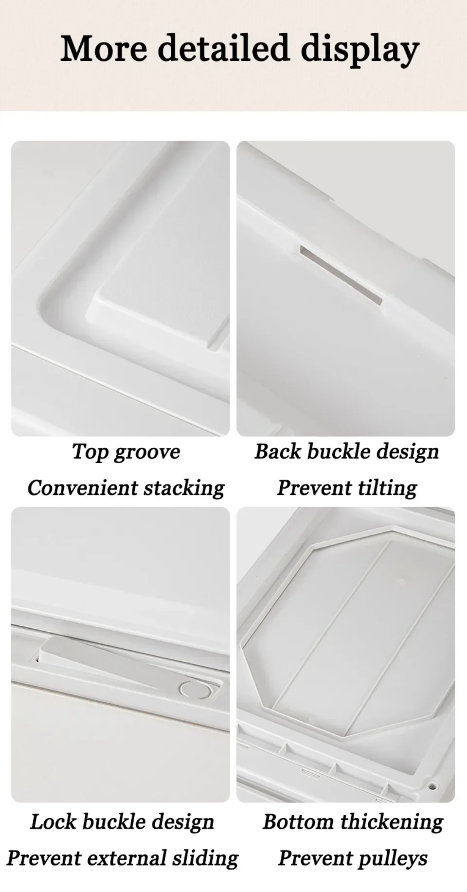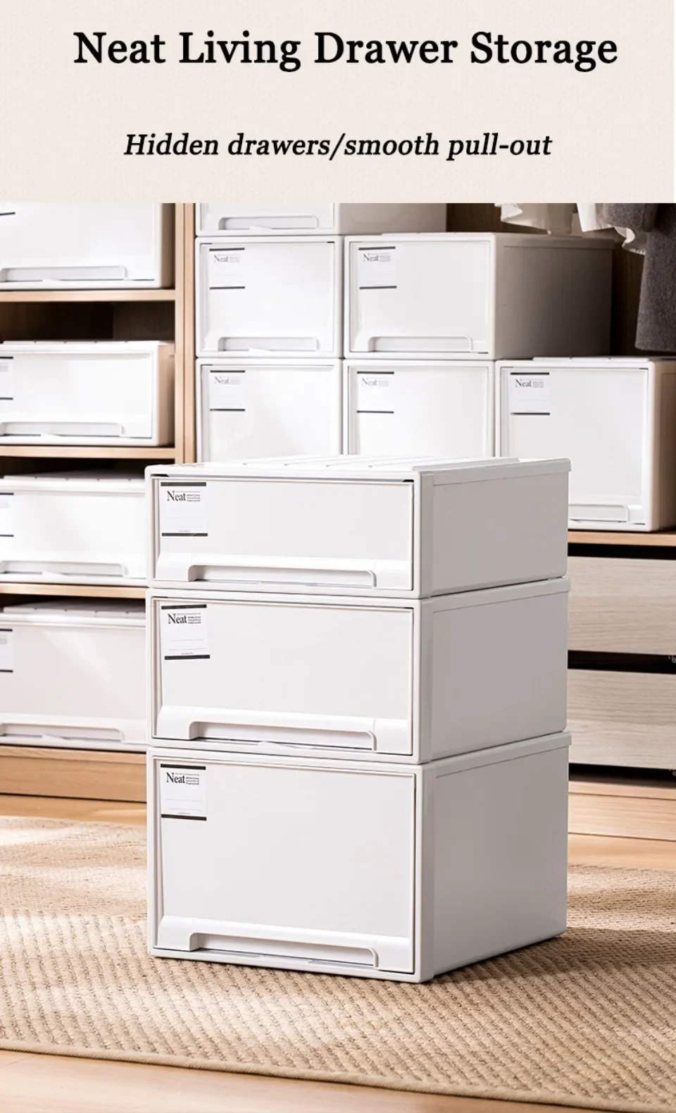 -1. Stackable Design: Our Storage Box with Drawers features a cylindrical handle design, a special top texture, and an anti-slip washer. Stackable and easy to access, it keeps your items organized and floors scratch-free.